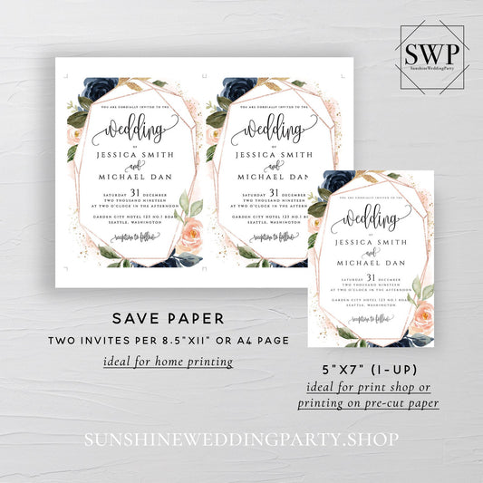 Navy Blush Floral Wedding Invitation Template